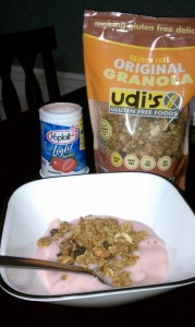 I was pumped to learn that Yoplait is Gluten Free! I enjoy eating yogurt but sometimes it needs a little something extra. I actually found Udi’s Gluten Free Granola at our Wal-mart and it was $2.00 cheaper than at Whole Foods.