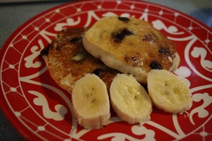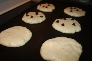 Cut up bananas and put in ziploc bag – sqeeeeeze (kids like this part)! Mix the remaining ingredients in a bowl. Cut a corner off of the plastic bag and add to batter. The batter will be lumpy. Put 1/4 cup of batter on a warmed griddle You can add chooclate chips or nuts if you want. Flip when bubbles come through batter. Cook 1-2 minutes on each side.