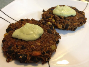 I have just about finalized my black bean sweet potato burger recipe. When I get it right I’ll share it. Here is my latest attempt topped with avocado ranch.