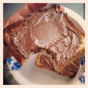 I picked up a jar of Nutella during my last grocery trip. I have been enjoying it on toast and waffles for breakfast this week! Chocolate in a spreadable form – ummm YES!