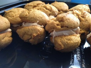 I love fall! For so many reasons it is my favorite season – the leaves, the weather, and the food! Today we had a family fall event at some friends house. Like I do before any food event at a friend’s house I offered to bring a Gluten Free dish for the table. I decided to bring a dessert since it was going to be a hot dog meal. After searching Pinterest (LOVE IT) I found these two Pumpkin Whoopie Pies and Pumpkin Sandwich Cookie recipes. To make mine I blended the two recipes a bit. It created a moist pumpkin cake like cookie with a cinnamon cream cheese filling. SO GOOD!!
