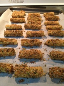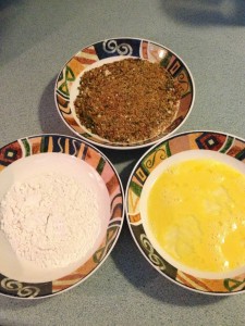 Pull out frozen cheese sticks and take them through the prep bowls. Flour – egg – bread crumbs.