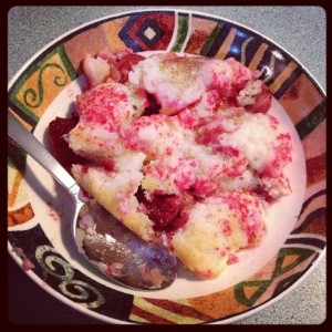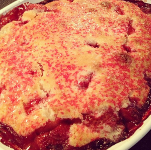4. Cover with sugar crystals and bake for 50 minutes. If you prefer your cobbler to be gooey just cook for 40 minutes.