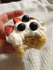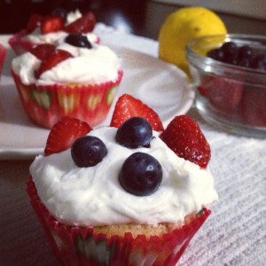 Follow the instructions on the box to make the cupcakes. If you are using the GF Betty Crocker mix I HIGHLY recommend following these instructions instead of the ones on the box. You end up with a much better tasting cupcake – trust me! Allow the cupcakes to cool. Prepare frosting and mix in vanilla extract, lemon juice and lemon zest. Top cooled cupcakes with the lemon frosting and decorate with the berries.