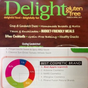 I first meet these wonderful people in Chicago and was blown away by their passion and knowledge. Not only do they make amazing Gluten Free products but they truly care! Jay Harper started Red Apple Lipstick in 2007 to create a better, safer cosmetic product for women. They even have 10 reasons why you should use Red Apple Lipstick. If that’s not enough, it was rated the Best Gluten Free Cosmetic Brand by GFREEK.com. They are even listed in the next issue of Delight Magazine.