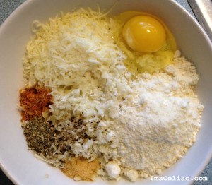 Heat oven to 425 degrees. Put grated cauliflower in a bowl and microwave for five minutes. Once cooked combine the rest of the ingredients in the bowl.