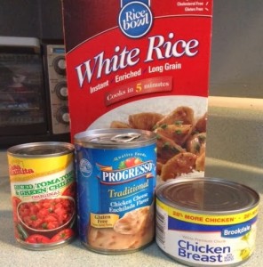 Here is how it went down. I cooked up some rice from a box. Then I combined can chicken breast, ro-tel and Progresso’s Chicken Enchilada soup in a skillet. Once the chicken, cheese mixture was heated we ate it over the rice. We also used tortillas chips to dip with. Was this dinner awesome? No. Did it feed the family? Yes.