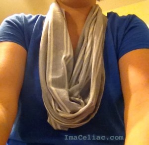 I recently went to a retail store and found a gray infinity scarf I loved. However the price tag of $34 was way more that I was up for. I then walked to a different retailer and purchased a $6 clearance men’s gray t-shirt. By following the instructions below I made my own infinity scarf.