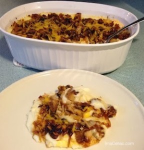 This dish tasted and smelled amazing! It was also very good reheated the next day for lunch. By using instant potatoes this wasn’t a firm casserole. You could use mashed potatoes from fresh boiled potatoes if that is the texture you are going for.