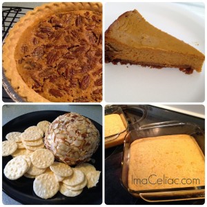 | Top left: Pecan Pie, Top right: Pumpkin Pie, Bottom left: Bacon Ranch Cheese Ball, Bottom right: Corn Casserole |