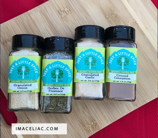 Let’s talk seasoning with Just a Little Spice. This is a new North Carolina company that is rewriting the book on spices. Not only are they organic, non-GMO, sugar free, kosher, all natural but also Gluten Free! Sauces and seasoning are notorious for hiding gluten so it is great to find a brand that gets it and creates safe products for our community.